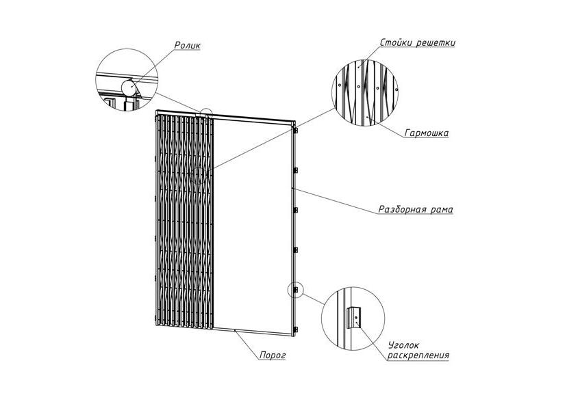 Комплектация: сдвижное полотно, неподвижное полотно, разборная рама, крепежные элементы, проушины для навесного замка, откидной порог